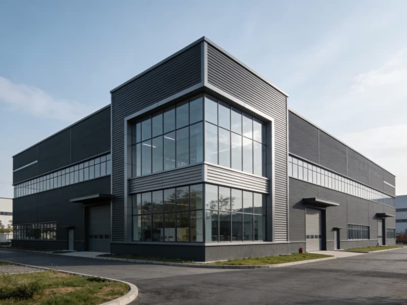 從外觀上看,廠房整體以深灰色為主色調(diào),搭配淺灰色的線條勾勒,呈現(xiàn)出沉穩(wěn)大氣的質(zhì)感。墻面采用金屬材質(zhì)與玻璃幕墻相間的設(shè)計,既保證了建筑的堅固性,又增強(qiáng)了采光與通透感,讓建筑在工業(yè)氛圍中不失現(xiàn)代氣息。