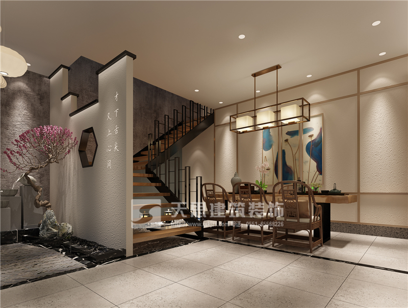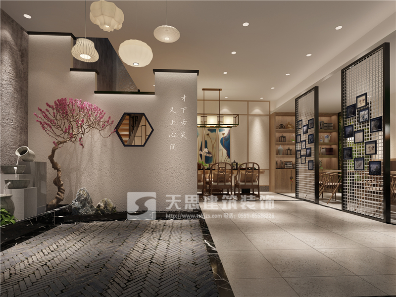 圓柱吊燈、墻壁刻字、墻壁上的國畫、餐具的擺放,一切的一切相互融合起來,形成一個優(yōu)質的就餐環(huán)境,在這里讓客戶感受到不一樣的就餐氛圍。