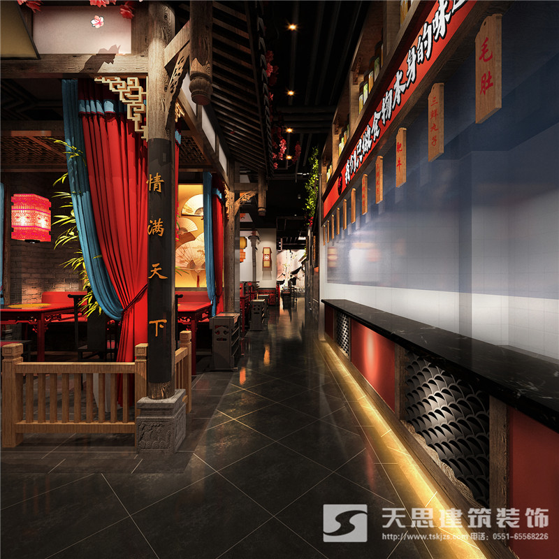 本次為合肥香天下火鍋店分店徽淮南店裝修設計效果,在本次火鍋店設計中,設計師采用新中式做為空間設計風格,設計師希望讓客戶在這里感受到不一樣的氛圍。