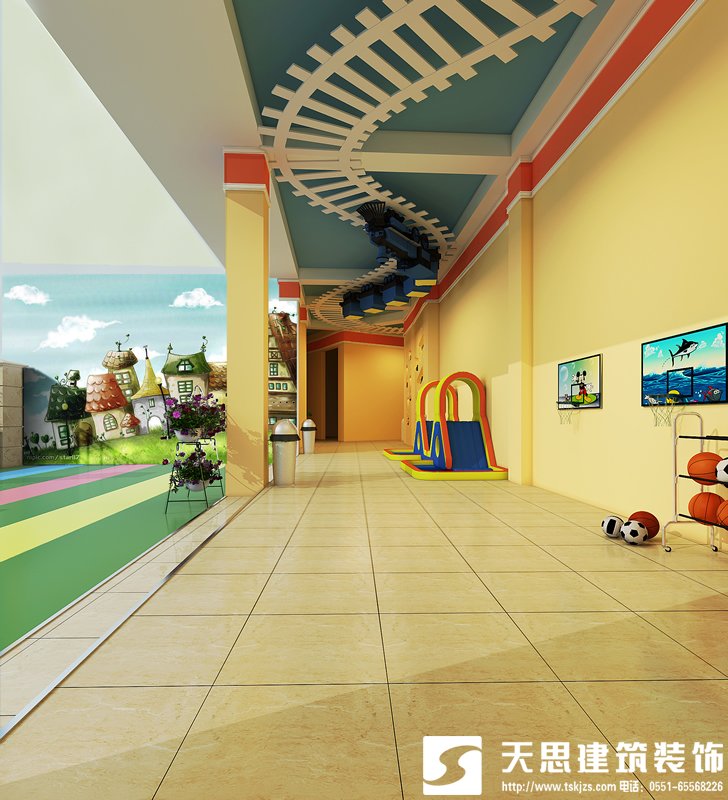 藝術(shù)幼兒園環(huán)境,首先在色彩上,應(yīng)該給幼兒以美的視覺享受。圖畫色澤宜單純,接近自然,這樣的色彩令純潔的孩子們產(chǎn)生豐富的想象:廣袤無邊的綠色草原、密密的森林、遼闊的藍(lán)天、飄浮的白云、蔚藍(lán)的海洋和可愛的小動物們。這些單純、源于自然的色彩,易使閱歷淺短的幼兒產(chǎn)生共鳴、易于理解。便于他們欣賞、借鑒、表現(xiàn)。合肥的幼兒園都比較注重色彩的使用,但總體上水平不高,天思裝飾在設(shè)計(jì)裝修中感受頗深,有的幼兒園只是簡單的通過五顏六色的色彩來展示環(huán)境的炫目。幼兒們喜愛明快的色彩對比,活潑好動的幼兒從中可以感受到色彩變化的節(jié)奏和共振。在為幼兒們創(chuàng)造色彩對比、跳躍的同時,應(yīng)考慮畫面的整體美,采用較大淺色塊支撐,可使畫面既有局部美的變化又有整體協(xié)調(diào)感,能解決幼兒園一堵墻面內(nèi)容多色調(diào)不易統(tǒng)一的問題。使環(huán)境更藝術(shù)化。