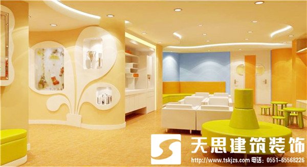 幼兒園如果采用歐式裝修,一定是那種簡(jiǎn)歐風(fēng)格。簡(jiǎn)單的吊頂造型,相對(duì)簡(jiǎn)單的線條。體現(xiàn)出整個(gè)幼兒園的層次即可。合肥天思幼兒園設(shè)計(jì)師提醒大家切勿把整個(gè)教室裝修的非常歐式、非常復(fù)雜,因?yàn)樾∨笥褌冞€難以理解這些復(fù)雜的東西,而過于復(fù)雜的造型,分散幼兒的注意力,影響老師的授課。簡(jiǎn)單的墻面幾乎沒有過多的裝飾,把所有的視覺重心放在幼兒的教具上。