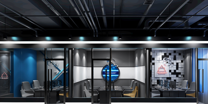 小型電競(jìng)區(qū),不僅可以有效利用空間,也讓競(jìng)技區(qū)不顯得過(guò)于空曠。兩側(cè)炫酷的背景墻設(shè)計(jì),帶來(lái)強(qiáng)烈的視覺(jué)沖擊力,散發(fā)靛藍(lán)燈光的臺(tái)階設(shè)計(jì)讓電競(jìng)區(qū)更顯炫酷。