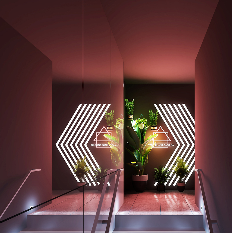 電競(jìng)氛圍的營(yíng)造不是單一的,而是無(wú)處不在。樓梯入口處醒目而又充滿(mǎn)趣味的燈帶指示標(biāo),巧妙的標(biāo)識(shí)著空間的轉(zhuǎn)角,入門(mén)處便有一種電競(jìng)感。