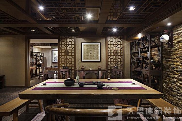 第一是傳統(tǒng)的地方風(fēng)格,這種風(fēng)格茶室多位于風(fēng)景旅游區(qū)、公園內(nèi),由于這種建筑本身就具有明顯的地方特色,因此茶室室內(nèi)設(shè)計(jì)大多也具有相同的風(fēng)格,因此多采用地方性較強(qiáng)的材質(zhì)進(jìn)行裝飾,如木、竹、藤以及石材等。頂棚可根據(jù)建筑本身的屋頂進(jìn)行設(shè)計(jì),墻面盡可能打破單調(diào)感,可采用石材墻面或是木質(zhì)梁柱等來實(shí)現(xiàn),墻面可采用地方工藝品或是條軸字畫進(jìn)行裝飾,地面以青磚或是仿青磚材料鋪設(shè)為宜,也可以采用毛面花崗石。