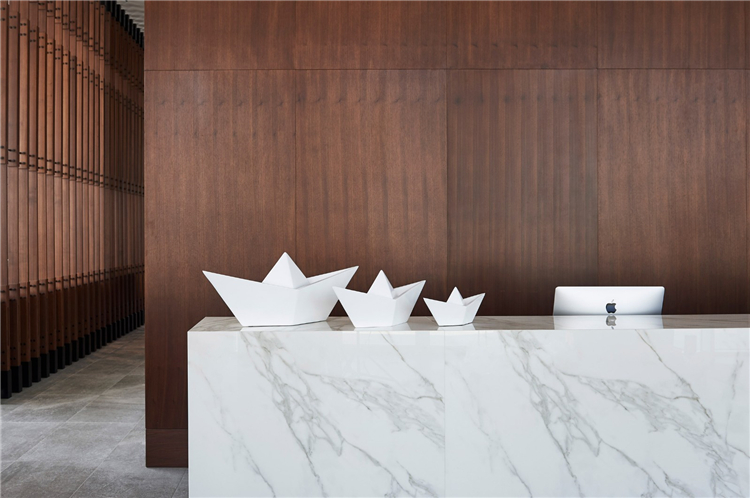 大堂和餐廳的內(nèi)部特色是光滑的白色石膏墻壁、大理石、黃銅和深色的木材家具。這里用了一個白色,純凈,簡單的立面,走進(jìn)里面,仍然會感覺到白色,但同時我們使用了一些其他的材料。所有的顏色都來自真實的材料,讓你進(jìn)入室內(nèi)時更溫暖。