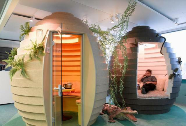 說起最吸引人跳槽的辦公室設(shè)計,大家可能第一時間想到的就是谷歌公司的創(chuàng)意辦公室.辦公區(qū)域的每一處設(shè)計都別出心裁,融入了地方色彩,別具風(fēng)情.在這樣舒適愉悅的環(huán)境下辦公,谷歌總是能夠帶來許多令人眼前一亮的產(chǎn)品也有因可循了.谷歌辦公室以快樂健康,高效工作為目標.可以帶狗狗進入辦公室(貓星人暫時不行)的人性化規(guī)定,打造與大自然融合的熱帶雨林辦公區(qū)域,提供挑選自己喜歡的廚師做飯的個性化餐廳服務(wù).谷歌的確稱得上"要創(chuàng)造世界上最令人感到幸福、最能激發(fā)生產(chǎn)力的工作場所."的辦公室.
