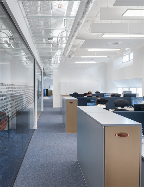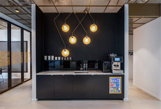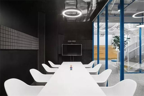 時(shí)尚與藝術(shù)并存的辦公室設(shè)計(jì)案例:整個(gè)空間設(shè)計(jì)手法簡(jiǎn)約,原有建筑構(gòu)造和設(shè)備管線都展露無遺,色彩的巧妙構(gòu)筑讓這處極簡(jiǎn)loft風(fēng)的辦公環(huán)境充滿了時(shí)尚的活力氛圍。墻面上充滿活力的圖案和一張乒乓球桌是視覺中的主角,而主入口就在這里。這里沒有傳統(tǒng)的接待臺(tái),訪客進(jìn)入辦公室,可以為自己沖杯咖啡,然后進(jìn)入到內(nèi)部空間。入口處設(shè)有員工更衣室。辦公室的中央是一處大型演講廳,也是主要的活動(dòng)場(chǎng)所。多功能演講廳配有看臺(tái)式階梯座、咖啡吧、屏幕和投影儀、講臺(tái)和所有其它必要的設(shè)備,即可以舉辦研討會(huì)、各種宣講,也是一處極為舒適的聚會(huì)場(chǎng)所。空間內(nèi)的照明設(shè)計(jì)非常獨(dú)特,采用了網(wǎng)格狀的矩陣布局,將所有燈具串聯(lián)在一起,形成精致的美學(xué)效果。整個(gè)空間形成一個(gè)明亮的背景,襯托出有趣的設(shè)計(jì)細(xì)節(jié)和墻面圖形設(shè)計(jì)。