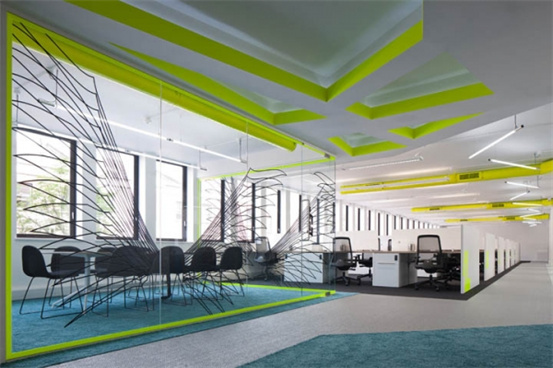 時(shí)尚辦公室裝修設(shè)計(jì):以白色為空間主調(diào),加入充滿活力的顏色,如霓虹黃色頂面線槽、以及柔軟的綠松石色地毯點(diǎn)綴在灰與黑色地毯間。裸露的頂面管道噴涂以同樣的黃色;每一組工位都以醒目的霓虹黃色字母加以標(biāo)識(shí)??臻g的其它色彩以中性色加以調(diào)和,以免跳躍的霓虹黃色太過強(qiáng)烈刺激。會(huì)議室的玻璃隔墻,上面繪制了一系列的天使(Angel)翅膀圖形,為密集的辦公區(qū)增添了豐富的視覺效果。休閑區(qū)與辦公區(qū)之間一道纏繞于金屬管道之間的紅色Z字型隔屏,活躍了空間色彩。設(shè)計(jì)師以清新簡(jiǎn)約的空間配色,打造了一個(gè)開敞明亮、且獨(dú)具個(gè)性特色的時(shí)尚辦公室。