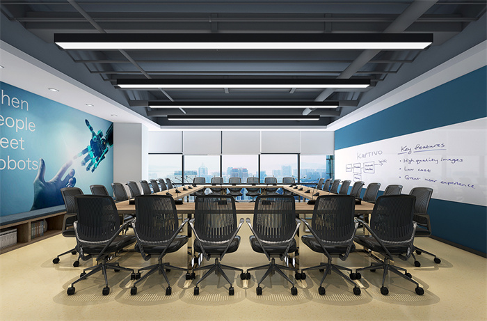 2、該辦公室裝修項(xiàng)目主要是使用者作為科技類產(chǎn)品的研發(fā)空間,要求足夠?qū)挸ǎ臻g的開放度與靈活度自由變換,辦公桌實(shí)現(xiàn)可隨意拼裝組合。設(shè)計(jì)師在設(shè)計(jì)上立足于;靈活共享的主線,以設(shè)計(jì)、現(xiàn)代、開放和連通為主題,著眼于科技發(fā)展的今天和未來(lái),創(chuàng)造出一個(gè)極富時(shí)代感和超前性的辦公空間。整個(gè)辦公空間以白色為基底色,輔以藍(lán)色的協(xié)調(diào)、中和,黑、 白、藍(lán)成為標(biāo)準(zhǔn)層的主色系,完美將辦公層的空間格局進(jìn)行分割,營(yíng)造出現(xiàn)代簡(jiǎn)約、自由開放的高端科技感。長(zhǎng)方形燈具應(yīng)用突出了現(xiàn)代科技的嚴(yán)謹(jǐn)態(tài)度,極大凸顯企業(yè)的文化感與產(chǎn)品前沿的設(shè)計(jì)感。會(huì)議室根據(jù)實(shí)際需求,實(shí)際軟裝時(shí)則以多彩元素為主題,一眼望去 ,布滿了明快的顏色 ,活潑卻不繁雜 ,采用的半透明亞克力玻璃椅是點(diǎn)睛之筆,帶給空間無(wú)限的靈動(dòng)感。黑板漆墻面設(shè)計(jì)則豐富了使用者的功能需求,達(dá)到裝飾和功能并存的目的。靈活的辦公桌還可自由變換,滿足不同需求的會(huì)議要求。