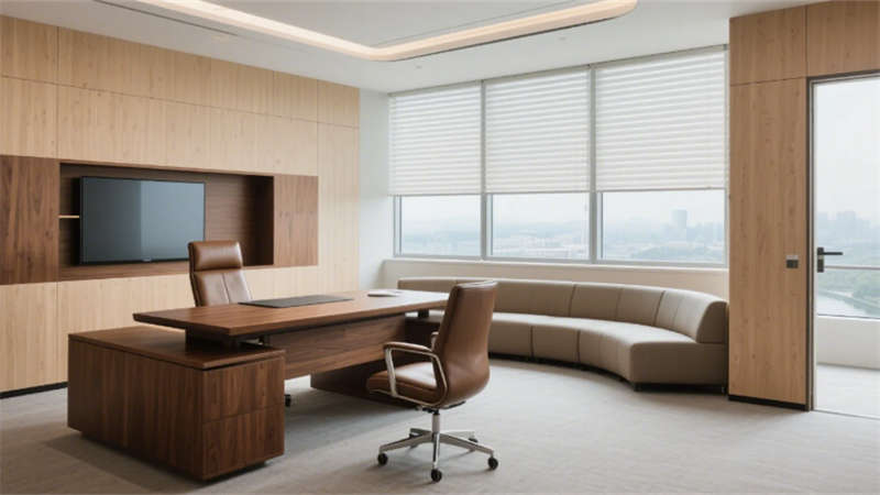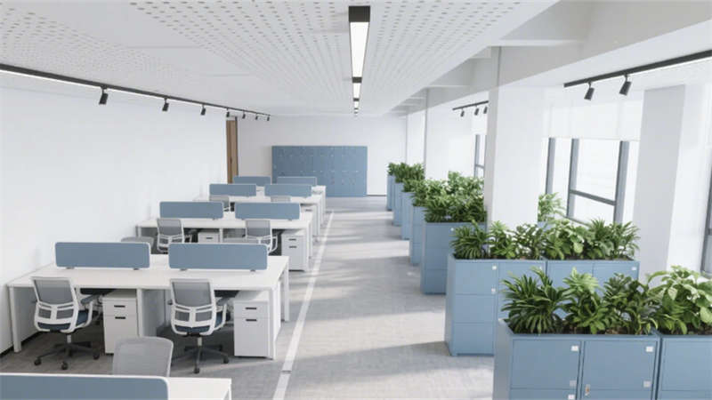 室內(nèi)空間強(qiáng)調(diào)功能與美學(xué)的平衡:入口大堂通過(guò)12米挑高藝術(shù)玻璃墻與企業(yè)色燈光系統(tǒng),構(gòu)建極具辨識(shí)度的第一視覺(jué);開(kāi)放式辦公區(qū)以模塊化工位、綠植隔斷及通透采光優(yōu)化協(xié)作效率;高管辦公室與會(huì)議空間則運(yùn)用木飾面、吸音材質(zhì)及智能設(shè)備,兼顧私密性與科技感。全案貫穿暖灰主色調(diào),局部以藍(lán)、橙跳色激活空間活力,啞光金屬、線性燈光與天然材質(zhì)碰撞,營(yíng)造理性而不失溫度的氛圍。