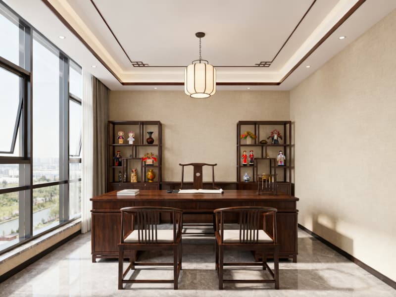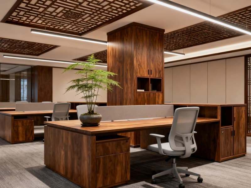 空間布局上,科學(xué)劃分開放辦公區(qū)、獨立辦公室、會議室、休閑區(qū)等功能區(qū)域,優(yōu)化動線設(shè)計,保證辦公效率與使用舒適度。色彩以淺色系為基底,搭配深棕色實木元素,營造雅致、沉穩(wěn)的視覺效果,同時通過落地玻璃窗、中式格柵吊燈等設(shè)計引入充足自然光線,減少空間壓抑感。