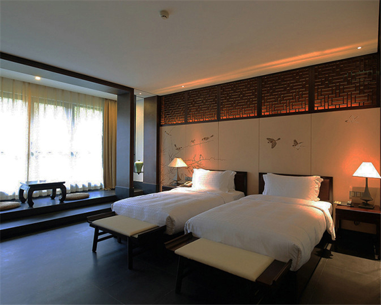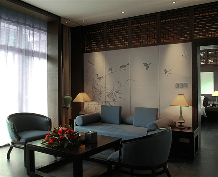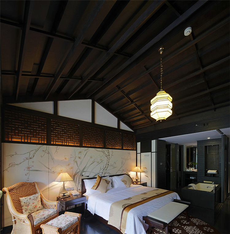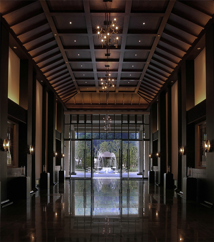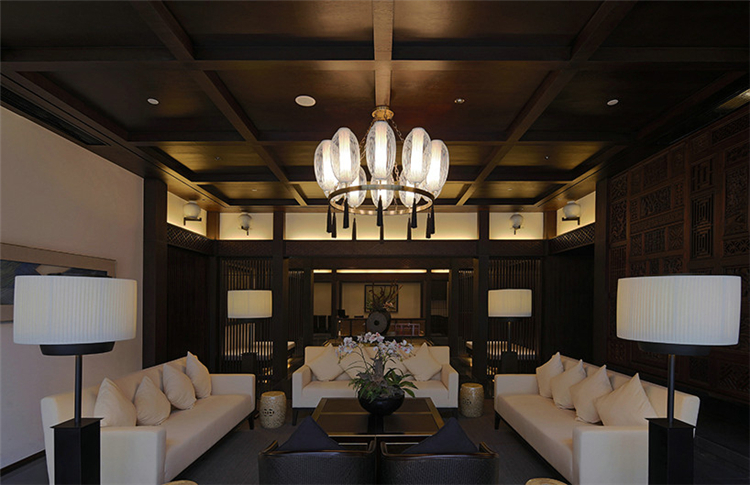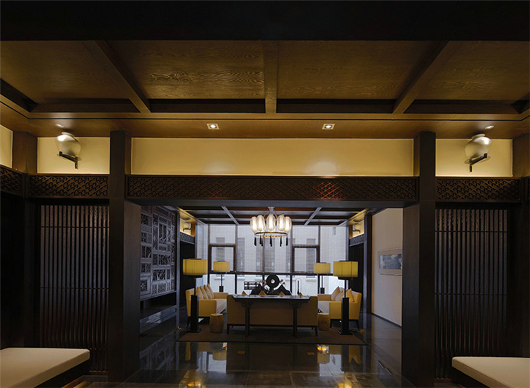 走入大堂,室內(nèi)空間寬闊,天花鱗次櫛比通向樓梯方向,墻面灰色石材雕刻,將桃花源記中的詩句映入客人眼簾,禪境古意撲面而來。鏤空屏風(fēng)隔墻的設(shè)計,讓空間隔而不斷,與具有傳統(tǒng)韻味的家具和配飾相互交融,打斷俗世的紛擾。柱子和天花上的裝飾燈具,利用金屬和木材兩種截然不同的材料和質(zhì)地,創(chuàng)造空間內(nèi)在張力,透過銳利的金屬、細(xì)膩的木質(zhì)線條強調(diào)空間結(jié)構(gòu),精致筆挺的吊燈,令空間由內(nèi)向外展現(xiàn)獨特魅力。