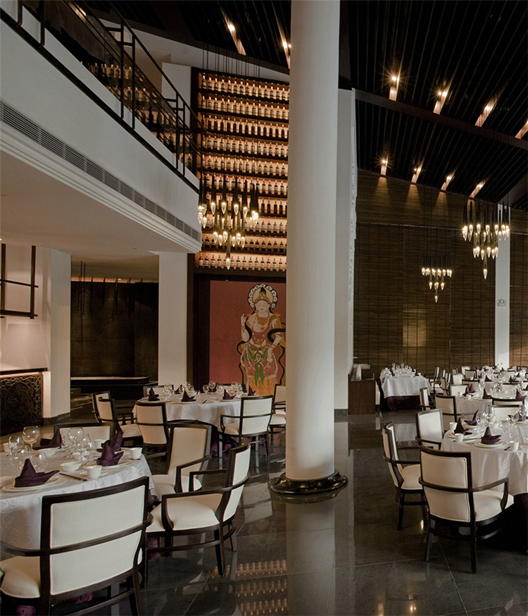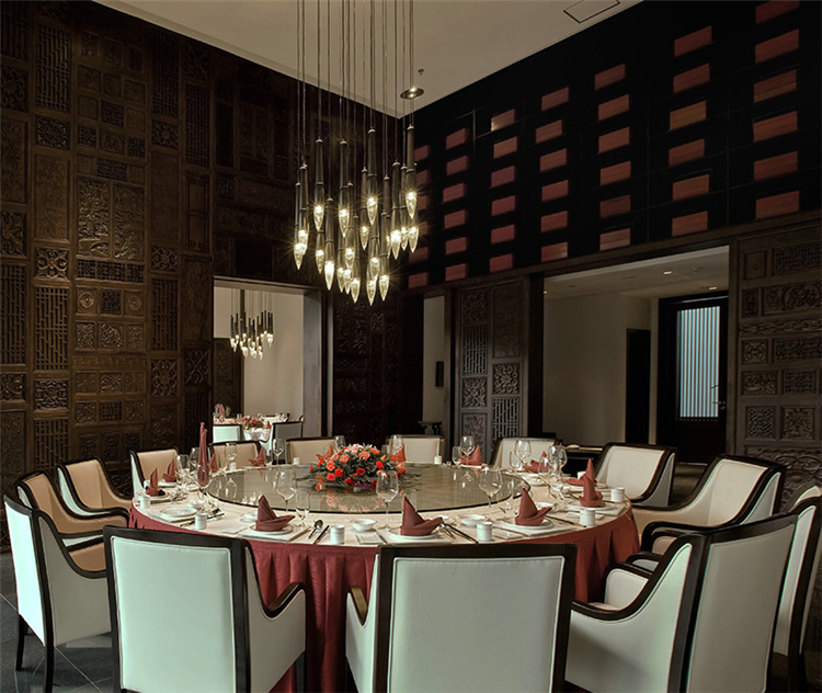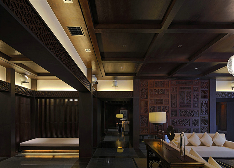 穿過悠長的走道,在灰白色空間配合溫暖沉著木色格子窗棱,讓客人逐步感受一種優(yōu)雅的熱情。天花的黑色線條設(shè)計,帶有極強的導(dǎo)向性,墻面上特別設(shè)計的壁燈,與柱體結(jié)合,極大地豐富整個空間的層次感和趣味性。