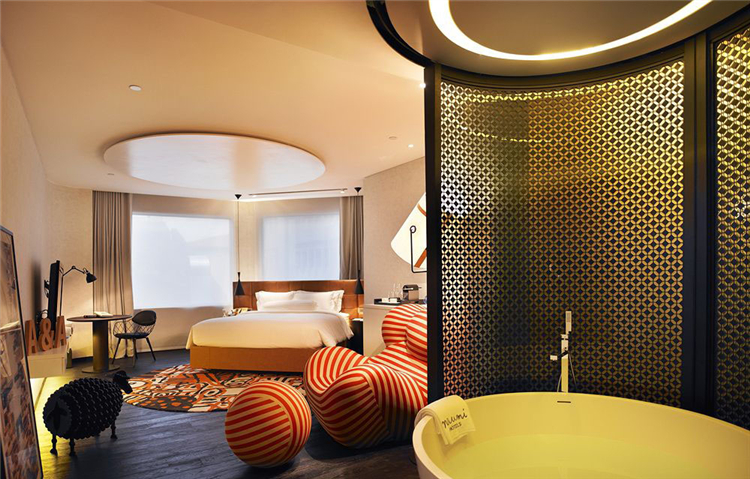 極簡(jiǎn)主義風(fēng)格并沒有妨礙設(shè)計(jì)師為酒店創(chuàng)造豐富的主題元素,以花草、猴子、孔雀、青蛙等為主題的森林圖案,遍布鏡面、墻壁等區(qū)域,營(yíng)造了精致的“城市森林”效果。