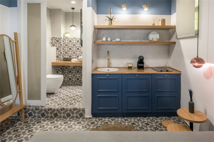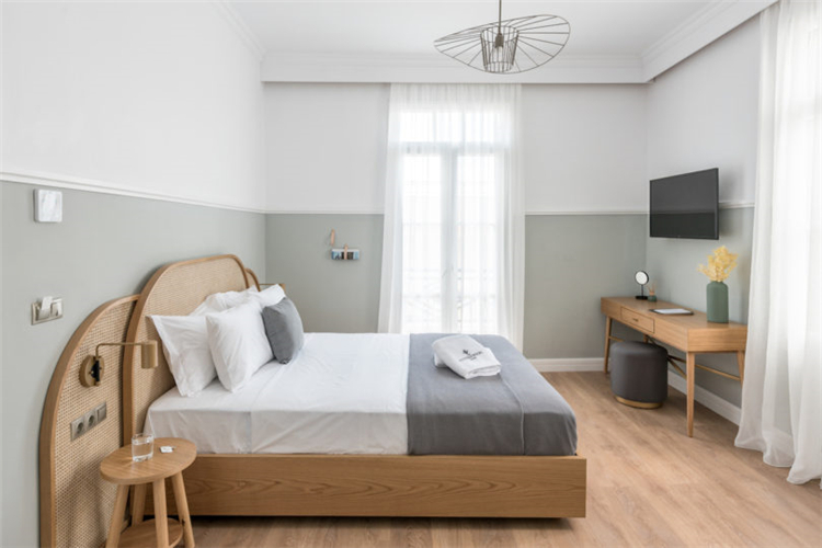 所有的地板都換成了天然橡木板和幾何水泥瓦。在整個客房中有一些小的現(xiàn)代細節(jié):如皮革墻壁掛鉤,極簡主義的植物增添了現(xiàn)代感。