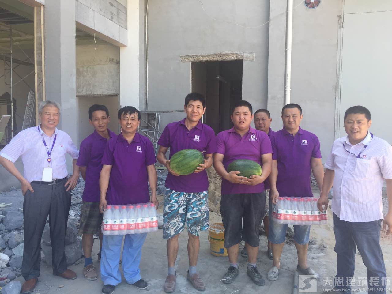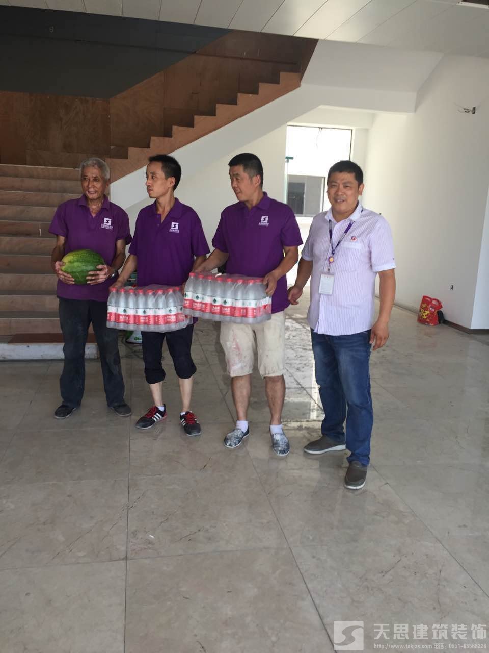 天思建筑裝飾公司為工作在第一線的天思項(xiàng)目經(jīng)理及工人送一點(diǎn)點(diǎn)小小的慰問品,謝謝你們的付出,你們辛苦了。天思一行對(duì)大家為趕工期、保質(zhì)量所付出的辛苦表示衷心感謝,并囑咐工地負(fù)責(zé)人要愛護(hù)裝修工人的身體,在保質(zhì)量為首要前提下抓好安全施工。施工盡量利用早、晚時(shí)間,盡量避開高溫時(shí)段;若發(fā)現(xiàn)有身體不適,要及時(shí)注意休息,情況嚴(yán)重的要及時(shí)送醫(yī)。