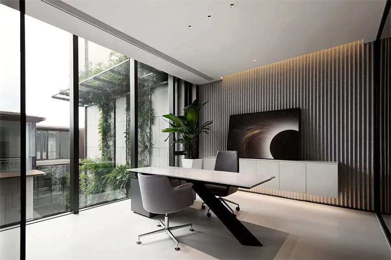 建筑是凝固的音樂,音樂是流動的建筑。二、三層分別是開敞式辦公和高管辦公區(qū),空間整體黑白分明、線條硬朗,像是鋼琴的黑白鍵,揮灑自如,動人的旋律,或悠揚或激昂。