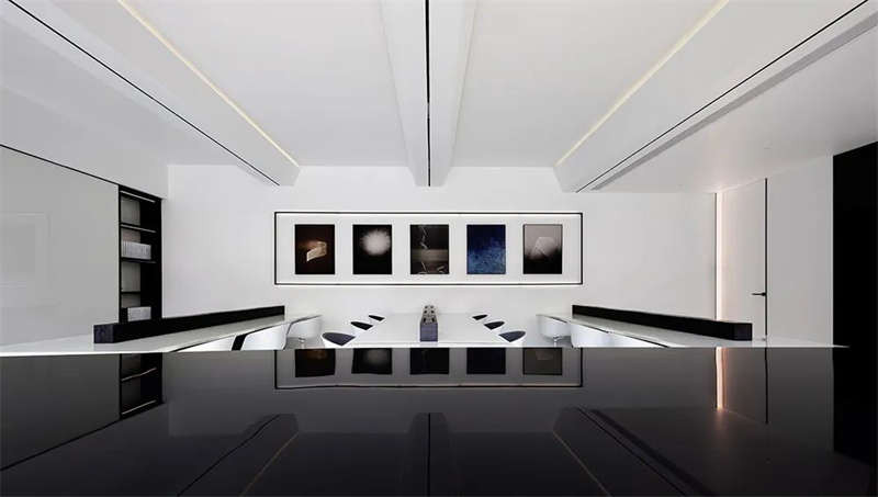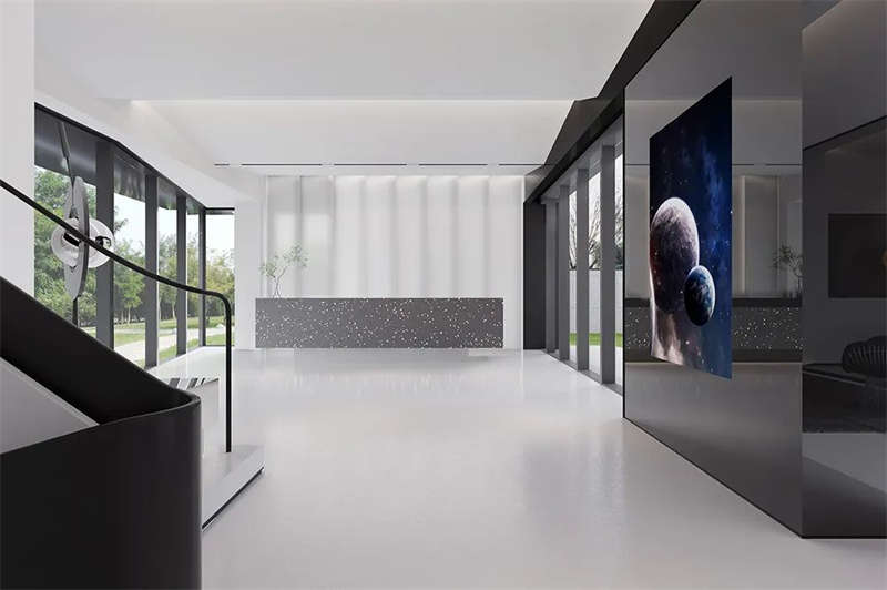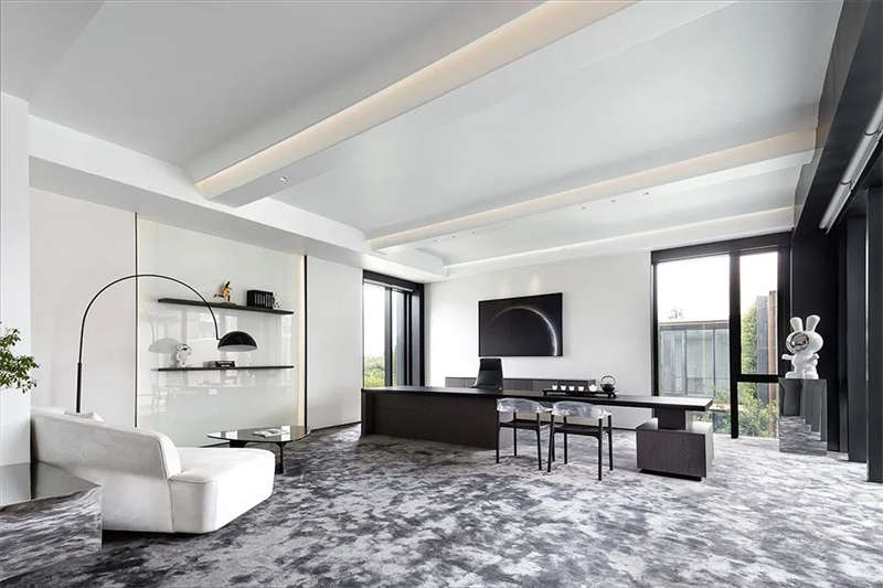 一層前臺,以黑白創(chuàng)作出一個極致簡潔的空間,兩側落地開窗實現(xiàn)無限延伸,空間的邊界更加柔軟,內庭院成為接待區(qū)的裝飾景觀,前臺及背景以“帆”這一意象表達對于宇宙世界探索的起航。樹脂地坪的無接縫特性解決了材質拼接的繁瑣,讓空間更加純粹簡潔。