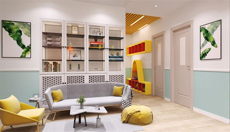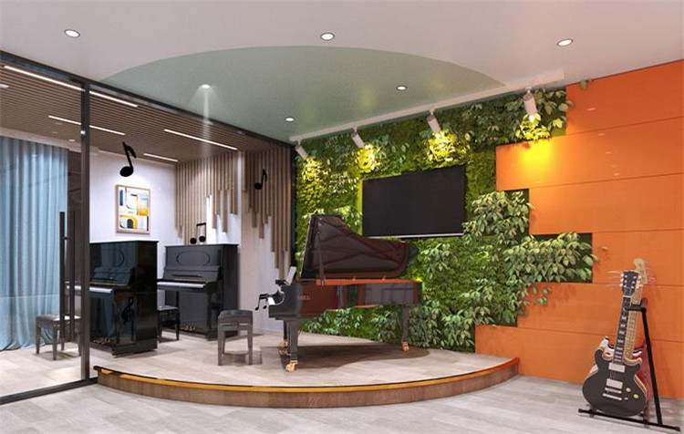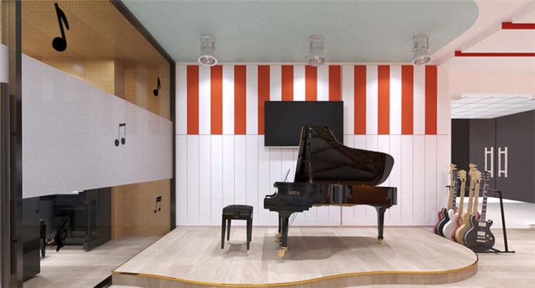 前廳不變的情況下,logo背景墻色調(diào)偏重,所以運(yùn)用了色彩降噪,添加了一些偏冷色調(diào),不僅能夠提升整個空間的舒適感,還能給孩子一個安全、放松的空間。結(jié)合了logo的主色調(diào),再進(jìn)行色彩搭配可以形成歡快、親切、活潑的色彩氛圍。與此同時(shí)還設(shè)置了也增加了兩間鋼琴室,提高了空間利用率。大廳玻璃教室內(nèi)墻面貼了吸音板,一方面體現(xiàn)機(jī)構(gòu)在音樂上的專業(yè)性,另一方面就是讓空間的隔音效果做到最佳,讓孩子在學(xué)習(xí)的時(shí)候不受干擾,能夠安靜的學(xué)習(xí)。