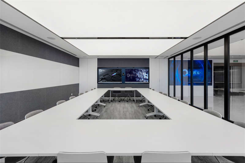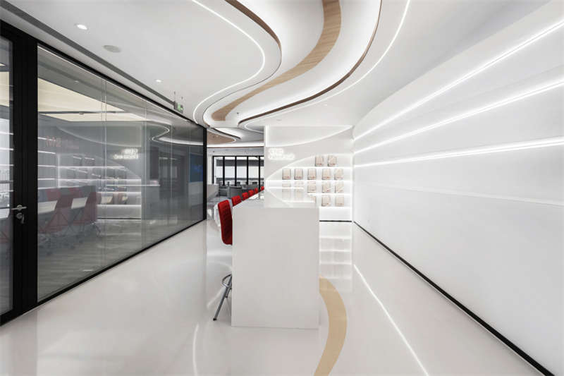 整個空間呈現(xiàn)出輕盈的姿態(tài),大面積留白給予空間呼吸感,曲線流動的造型就像一根善于變化而纖細不驚的絲線,即將牽引出一次次關(guān)于未來的探索。