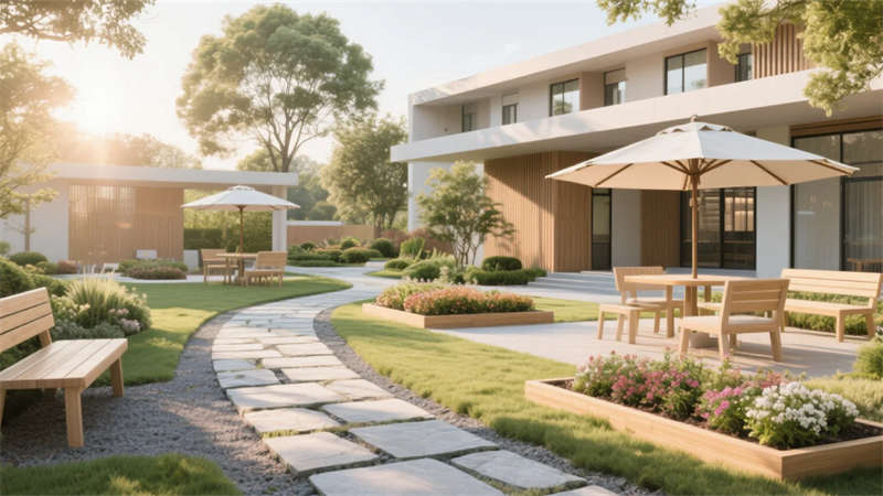 這套老年康養(yǎng)中心設(shè)計(jì)以現(xiàn)代簡約風(fēng)格為核心,營造一個溫馨、安全且充滿活力的生活空間。設(shè)計(jì)強(qiáng)調(diào)自然光與柔和色彩的融合,入口大廳以開闊布局和藝術(shù)元素傳遞家的溫暖,休息區(qū)則通過舒適沙發(fā)和綠植打造社交港灣。餐廳和活動室注重功能性,淺色調(diào)家具與靈活布局鼓勵日?;樱龠M(jìn)社區(qū)歸屬感。居住單元采用圓角細(xì)節(jié)和私密氛圍,確保舒適休憩??祻?fù)訓(xùn)練區(qū)融入防滑設(shè)計(jì)和自然光,支持健康活動。戶外庭院成為心靈綠洲,石板步道與花壇提供寧靜放松。多功能廳則適應(yīng)多樣需求,增強(qiáng)空間活力。整體設(shè)計(jì)以適老化理念貫穿,避免繁雜裝飾,突出簡約美學(xué)與人性關(guān)懷,讓每位長者感受到尊重與陪伴,在簡約中體驗(yàn)生活的美好。