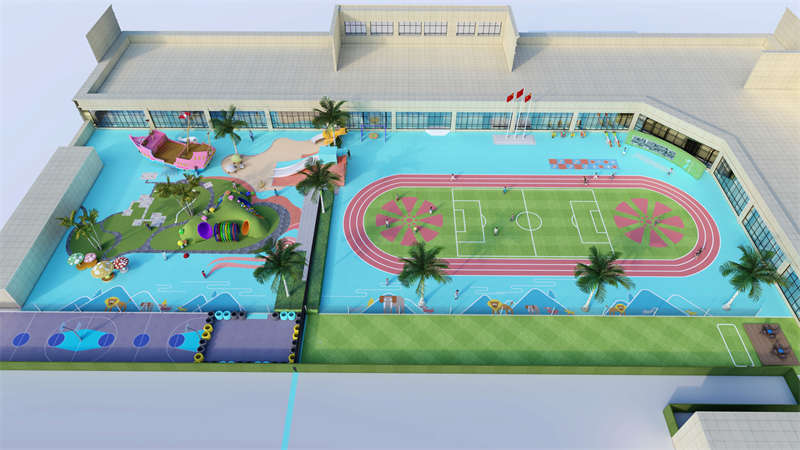 多層視覺(jué)透過(guò)不同形狀、符號(hào)、線條、弧度創(chuàng)造草地、樹林、巖石、隧道等各種素材讓小孩感受不同觸感,滑梯下的球池、走廊上的跑道、餐廳中的鞦韆、玻璃屋的烹飪室,不斷探索、學(xué)習(xí)、暸解世界。