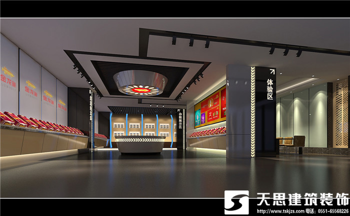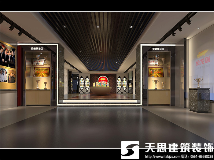 展廳是提高產品和企業(yè)品牌形象的場所,表達個性風格是這個空間的關鍵。金龍魚通過利用地面折線分割跑道的表現與背景形象的鮮明顏色相互配合產生強烈視覺沖擊效果,令人耳目一新,印象深刻。在其中部設計中,運用厚重的體量感,如半圓形及魚形,將所有的空間有機地聯(lián)系起來,長久、富貴、不可侵犯。