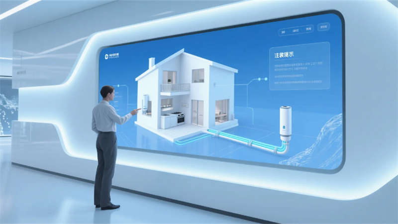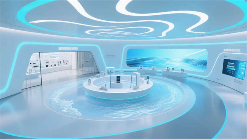 展廳以環(huán)形動線串聯(lián)六大核心模塊:入口10米寬LED水幕墻動態(tài)演繹凈水原理;中央懸浮式產(chǎn)品矩陣展臺,通過全息投影拆解RO膜過濾技術(shù);實(shí)景化場景區(qū)1:1復(fù)刻家庭廚房、商務(wù)辦公樓及工業(yè)廠房,搭配交互式水質(zhì)監(jiān)測實(shí)驗(yàn)臺;獨(dú)創(chuàng)的“虛擬管家”AR系統(tǒng),可生成個性化凈水方案并投射至合肥典型戶型模型??臻g頂部采用參數(shù)化設(shè)計的波浪形燈網(wǎng),象征長江與淮河水系交匯,地面嵌入城市節(jié)水?dāng)?shù)據(jù)可視化地磚,凸顯本土環(huán)保責(zé)任感。