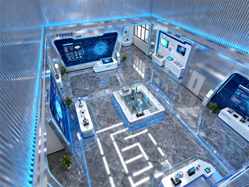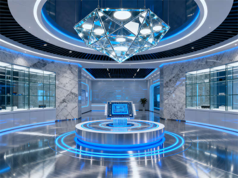 展廳入口處設(shè)置了沉浸式視覺裝置,通過光影效果模擬半導(dǎo)體芯片的微觀結(jié)構(gòu),讓參觀者剛進(jìn)入就能直觀感受到行業(yè)特性。往里走,核心展示區(qū)采用開放式布局,搭配通透的玻璃展柜與懸浮式展臺(tái),既方便參觀者近距離觀察展品,又能讓空間顯得開闊不壓抑。展示區(qū)旁設(shè)置了互動(dòng)體驗(yàn)區(qū),裝修上融入了柔和的木質(zhì)元素,平衡科技感帶來的冷峻,讓參觀者在互動(dòng)過程中更顯舒適。?